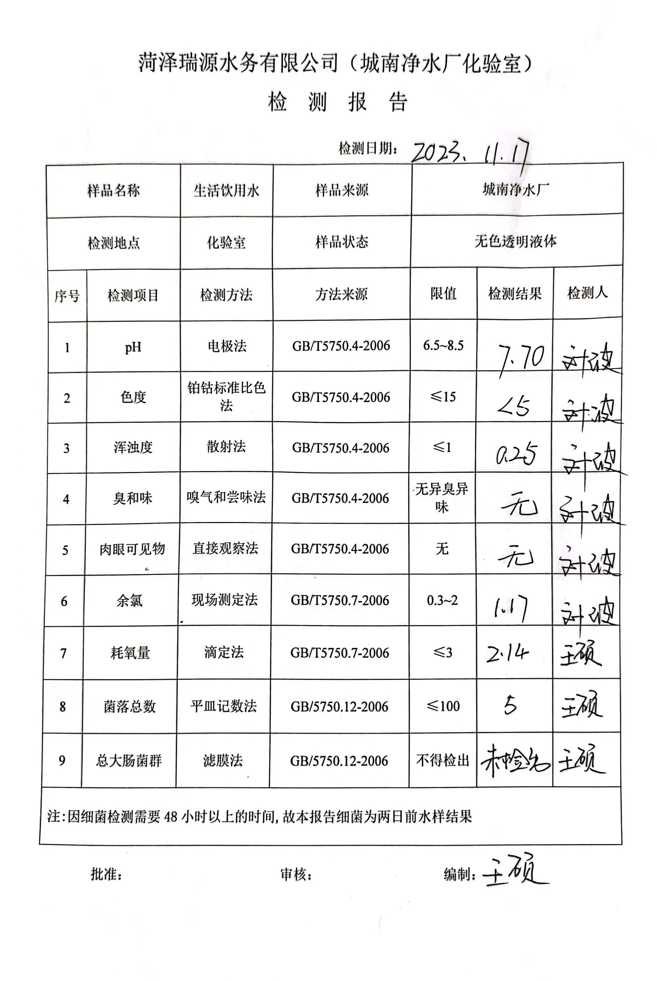 2023年11月17号出厂水水质检测报告