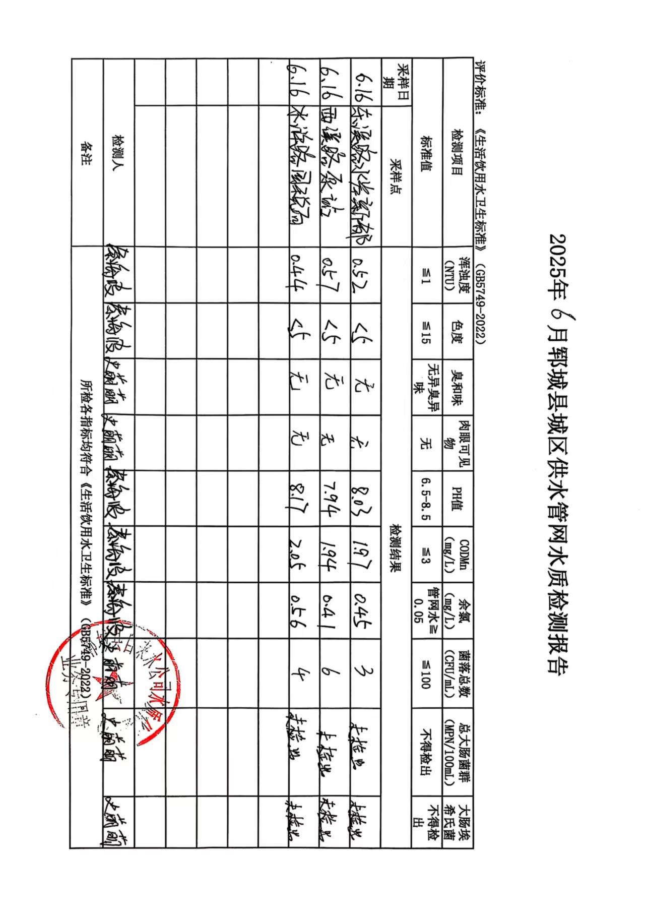 2025年6月16号管网水水质检测报告