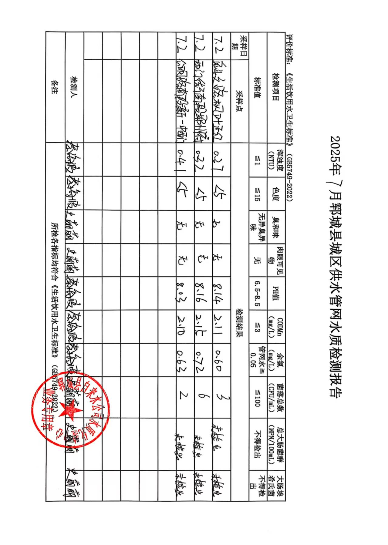 2025年7月2号管网水水质检测报告