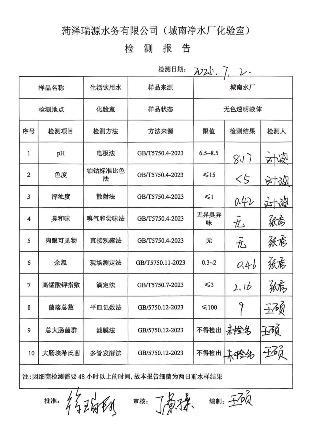 2025年7月2号出厂水水质检测报告