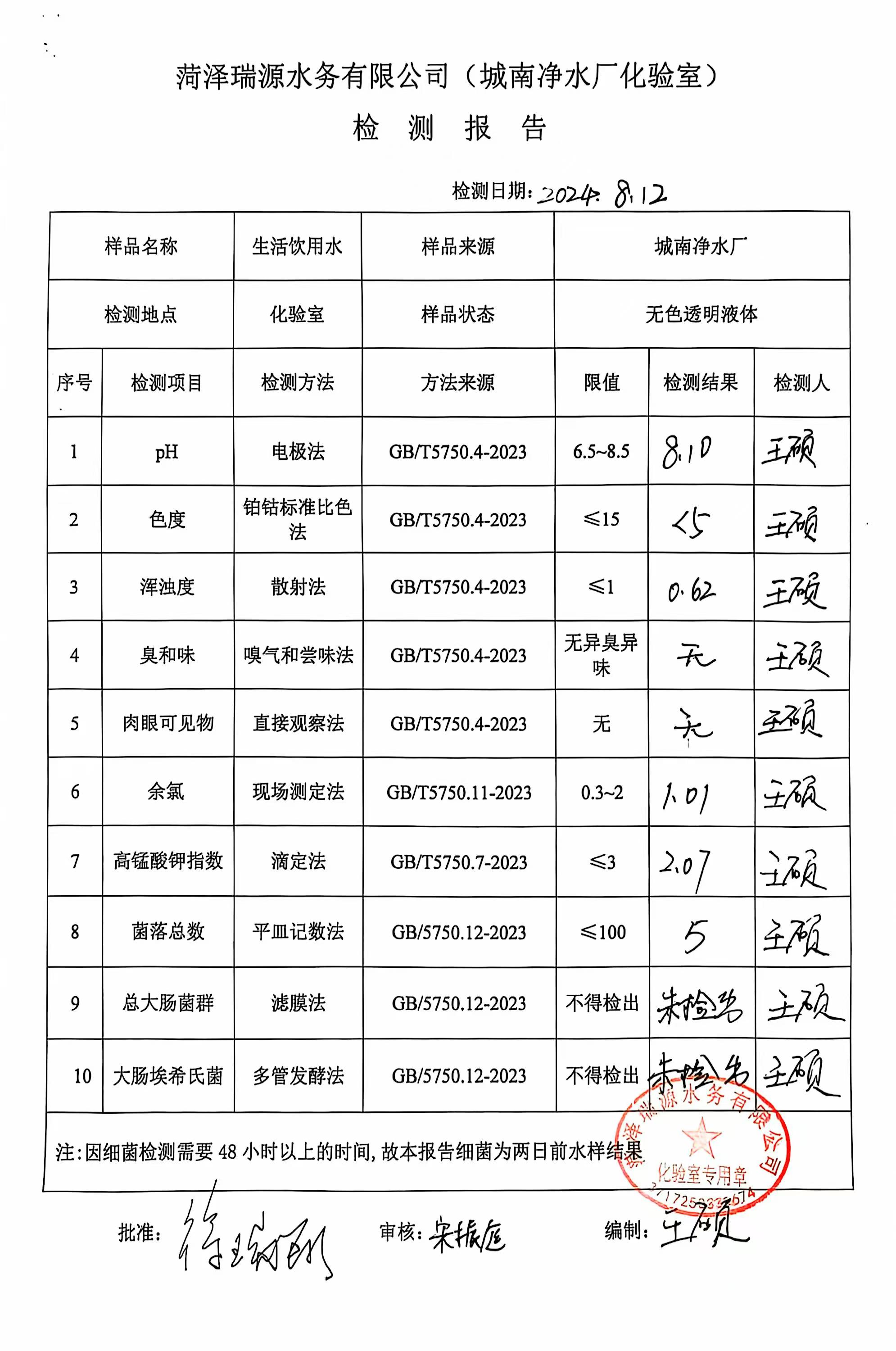 2024年8月12号出厂水水质检测报告