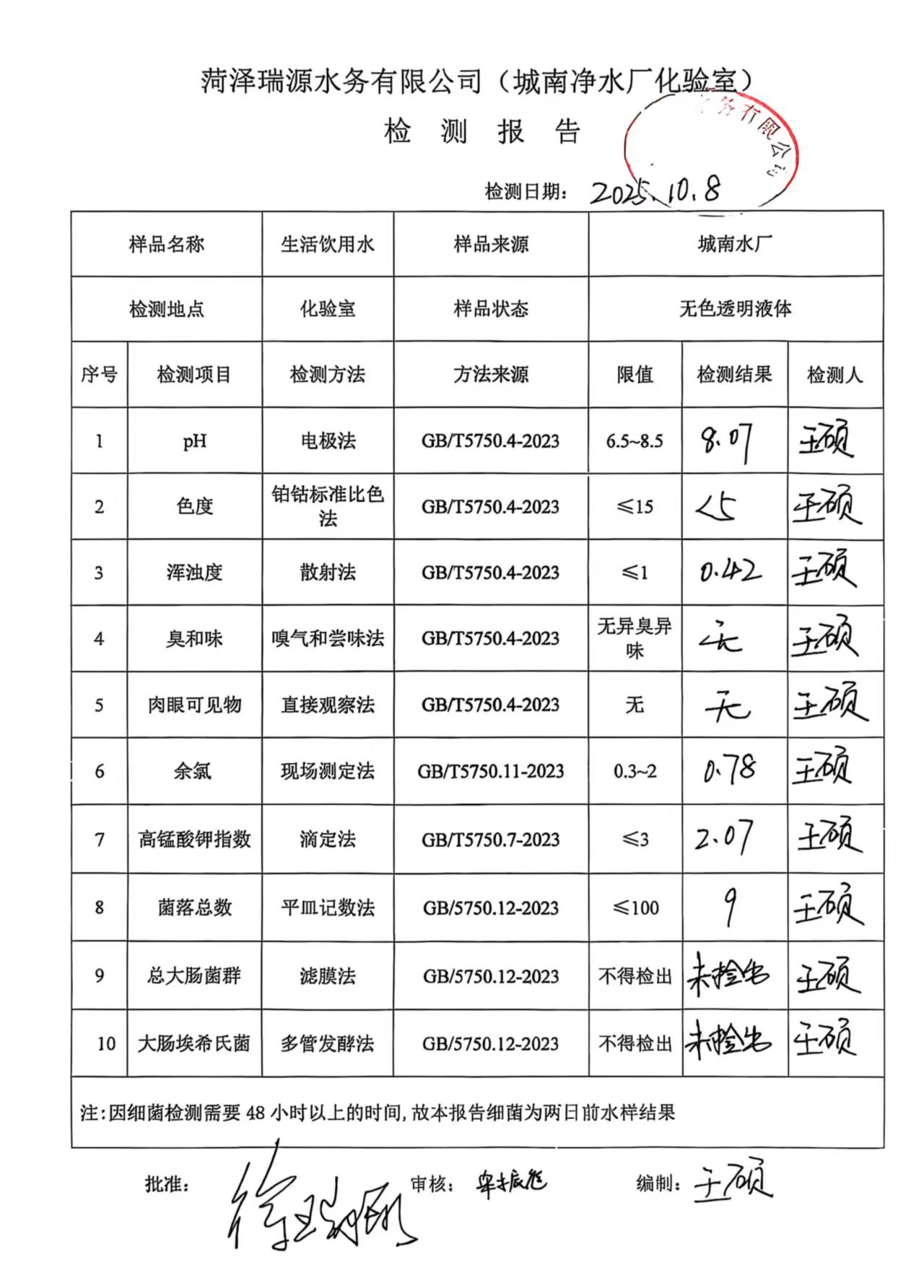 2025年10月8号出厂水水质检测报告