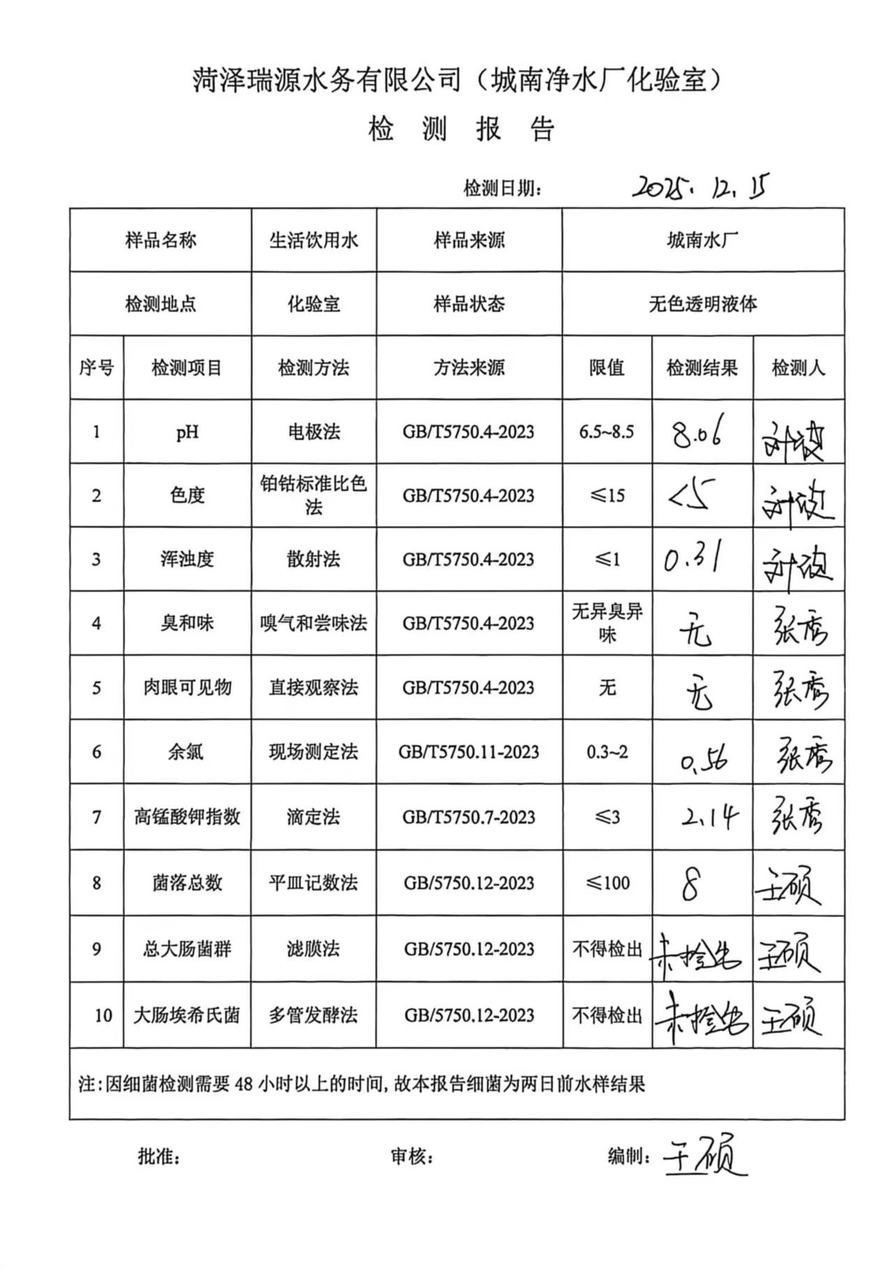 2025年12月15号出厂水水质检测报告