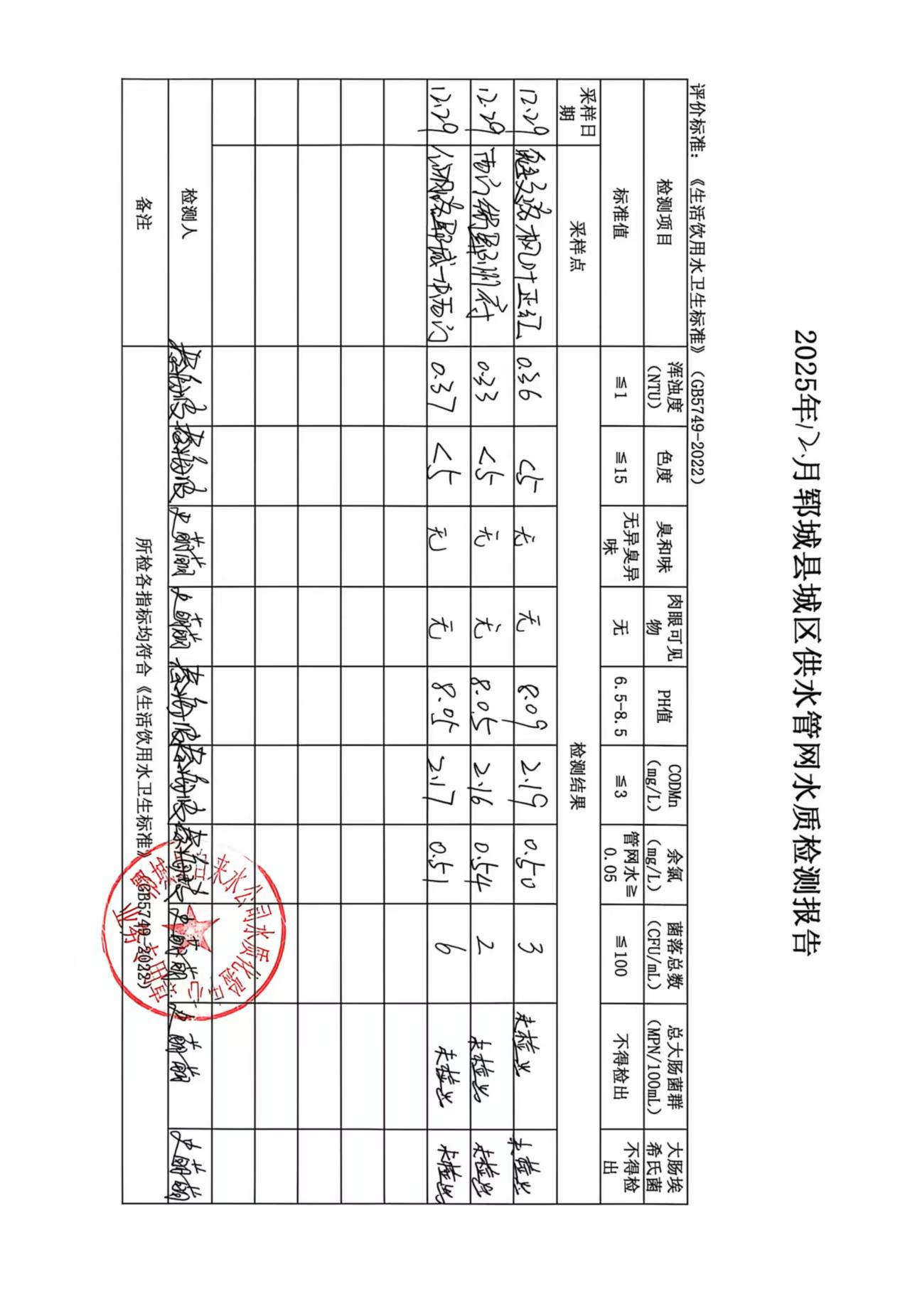 2025年12月29号管网水水质检测报告