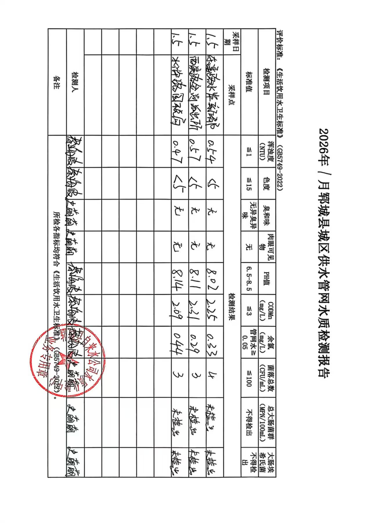 2026年1月5号管网水水质检测报告