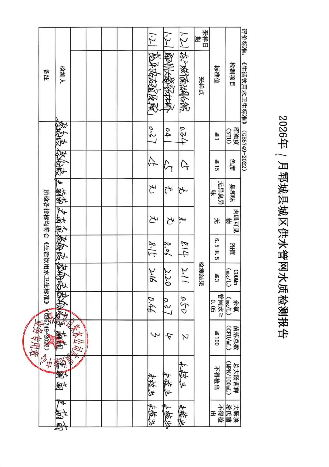 2026年1月21号管网水水质检测报告