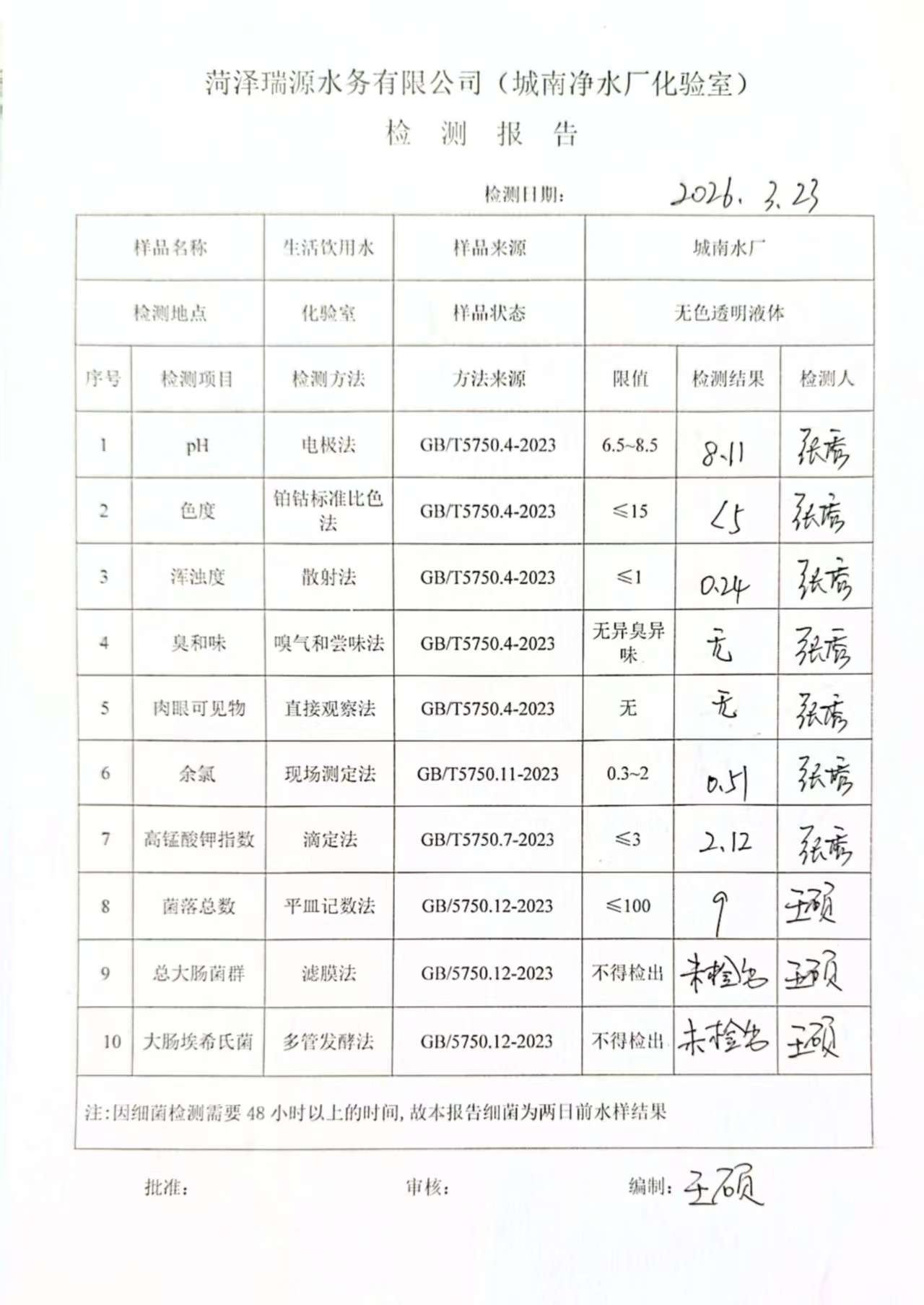 2026年3月23号出厂水水质检测报告